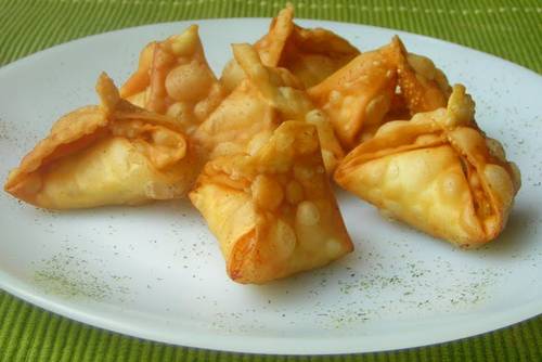 Ponga una cucharadita de esta mezcla sobre cada uno de los cuadrados. Doble en diagonal apretando bien los bordes al cerrar.