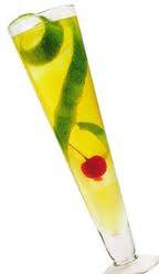 Mezclar en copa flauta, colmar con hielo molido y espolvorear encima azúcar impalpable. Se adorna con Marrosquino verde, ramita de menta y sorbete.