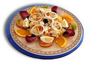 Cocer los huevos, asar el bacalao, quitarle la piel y las espinas y hacerlo tiras. Pelar y picar las cebolletas. Pelar las naranjas eliminando la parte blanca y cortarlas en lonchas finas. Poner todos los ingredientes en una ensaladera y aliñar con el aceite, el vinagre y la sal.