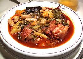 Poner el día anterior las "fabes" en remojo en agua fría. Cocer las judías hasta que estén tiernas. Pelar y picar la cebolla y el diente de ajo. Cortar el tocino y el chorizo. Escurrir las judías ya cocidas y reservar el caldo. En un pote con aceite hirviendo, sofreir la cebolla, el ajo, el jamón, el chorizo y el tocino. Cuando empiece todo a tomar color, añadir las judías y 1/4 de litro de caldo. Salpimentar y dejar a fuego lento durante media hora.