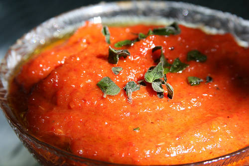 Utilice una licuadora para hacer una pasta de la berenjena y el pimiento, agregar el ajo y el vinagre y llevar la mezcla al gusto con sal y pimienta.