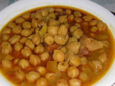 Cocer los garbanzos previamente remojados desde la noche anterior, cuando estén cocidos reservar y hacer un sofrito con el pimiento, cebolla, ajos cuando este pochadito añadir el tomate frito, dejar cocer un poco el sofrito y añadir todas las carnes troceadas y sofreír unos 10 min. agegar el vino blanco y dejar reducir un poco añadir la pastilla de caldo diluida en un poco de agua, el pimentón y laurel y el tomillo. añadir los garbanzos dejar cocer todo 1/2 hora aprox.