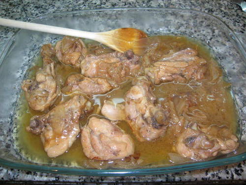 Corte las cebollas en rodajas finas. Corte la gallina en trozos y dórelos en el aceite y la mitad de la margarina, retírelos y agregue el resto de margarina y las cebollas.
