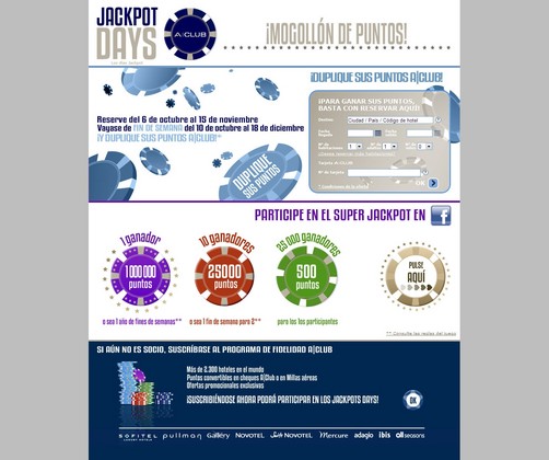 Del 6 de octubre al 15 de noviembre de 2011, A|Club propone a todos sus socios un gran juego- concurso en línea: los Jackpot Days. Entrando en la página Facebook « A|Club », los participantes tendrán la posibilidad de conseguir el Jackpot: 1 millón de puntos abonados en su tarjeta de fidelidad, o sea ¡el equivalente a un año de fines de semana gratuitos!, así como: