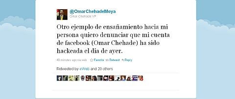 “Otro ejemplo de ensañamiento hacia mi persona quiero denunciar que mi cuenta de facebook (Omar Chehade) ha sido hackeada el dia de ayer”, escribió en su cuenta @OmarChehadeMoya.