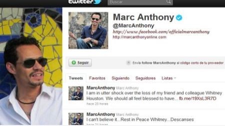 El salsero Mar Anthony lamentó hoy en su cuenta personal de Twitter la sorpresiva muerte de su colega Whitney Houston, quien falleció el último sábado aparentemente por su adicción a las drogas.