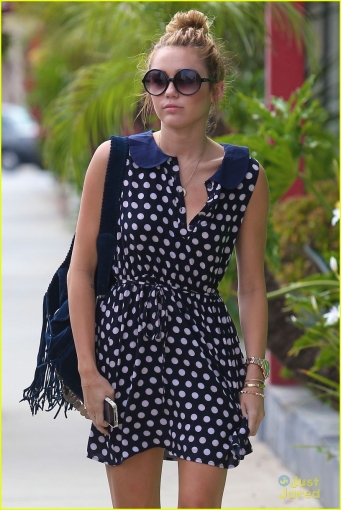 La cantante Miley Cyrus demostró estar a la moda apareciendo con un elegante traje de lunares mientras compraba en una tienda en West Hollywood, California.