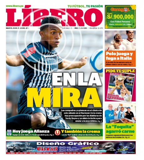 De esta manera, el diario Líbero tituló 'En la mira' en referencia a la táctica que estaría alistando el equipo crema para anular al juvenil jugador aliancista Yordy Reyna.