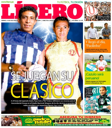 De esta manera, el diario Líbero tituló: 'Se juegan su clásico' en referencia a los técnicos Nolberto Solano y José Soto, quienes se verán las caras por primera vez como entrenadores de los 'compadres' luego de haber compartido varios partidos como jugadores con la selección peruana.