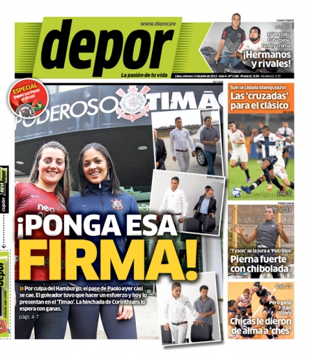 Por su parte, el diario Depor también destacó la demora en el fichaje de Guerrero por el Corinthians y tituló: 'Ponga esa firma' refiriéndose al retraso por el pedido económico del Hamburgo de Alemania.