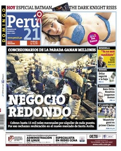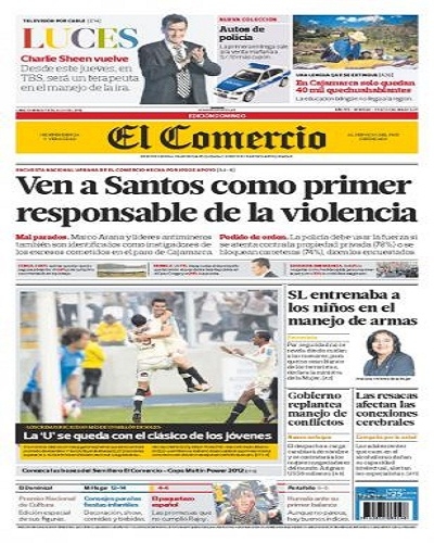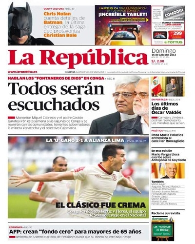 Entre los temas más destacados por la prensa escrita peruana para hoy domingo 15 de julio, está la percepción de la población respecto a los principales promotores de las manifestaciones antimineras en Cajamarca debido al proyecto Conga, a través de una nueva encuesta de la consultora Ipsos Apoyo.