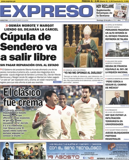 “Cúpula de Sendero va a salir libre”. El titular pertenece al vespertino Expreso y advierte de que Osmán Morote Barrionuevo y Margot Liendo Gil, ambos integrantes de la cúpula dirigencial del grupo terrorista Sendero Luminoso, recuperarán su libertad el próximo año y sin haber desembolsado dinero alguno al Estado a manera de reparación civil. El periódico resalta el hecho de que el Poder Judicial les impuso el pago de 3 mil 700 millones de nuevos soles, lo que finalmente no se efectuaría a causa del artículo 2 inciso 24 literal C de la Constitución Política, donde se establece que “no existe prisión por deuda”, excepto por un mandato judicial o por incumplimiento de obligaciones alimentarias.