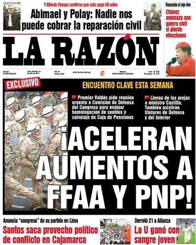 Las Fuerzas Armadas logran la portada de La Razón. El primer ministro Óscar Valdés presentaría esta semana un proyecto de ley a la Comisión de Defensa del Congreso, que consiste en el aumento de los salarios a los integrantes del Ejército peruano y a los de la Policía Nacional. Asimismo, la delegación congresal llamaría al Ministro de Economía Miguel Castilla para analizar esta posibilidad, al igual que la explicación de la situación de la Caja de Beneficios Militar-Policial, al igual que el reconocimiento de beneficios al personal policial.