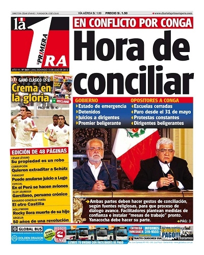 Finalmente, La Primera también brinda interés a la mesa de diálogo que se instaló en Cajamarca por intermedio de los conocidos eclesiásticos, subrayando no obstante que uno de los principales objetivos sería la suspensión del Estado de Emergencia en las jurisdicciones cajamarquinas.