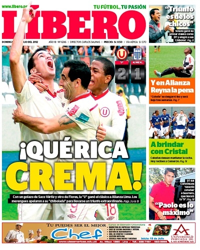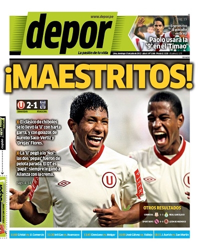 Por su parte, Depor también resalta la victoria de la “U” y además el pase del delantero Paolo Guerrero al flamante campeón de la Copa Libertadores de América, Corinthians de Brasil. La gaceta precisa que el ex jugador del Hamburgo alemán llevará el número 9 en el “Timao”, camiseta que anteriormente vestía Ronaldo, el máximo goleador en la historia de la Copa Mundial de Fútbol.