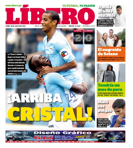 El diario Líbero titula: '¡Arriba Cristal!' en referencia a la victoria lograda por los celestes que lo ponen en lo más alto de la tabla de posiciones con 44 puntos.