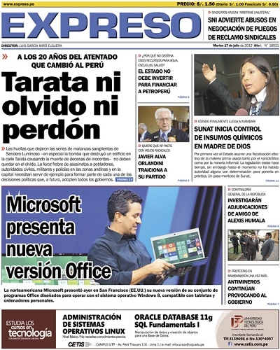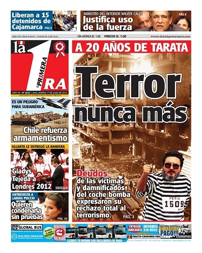“Tarata nunca más”, con este titular el vespertino La República inicia el desarrollo de la información. El día de ayer se cumplió 20 años del devastador ataque terrorista de Sendero Luminoso a la conocida calle miraflorina, ubicada en Lima, donde dos coches bombas que contenían media tonelada de dinamita mezclada con anfo, explosionaron alrededor de las 9.20 de la noche dejando 25 personas muertas y una gran cantidad de personas mutiladas. El atentado dejó destruido una ingente cantidad de edificios, departamentos, automóviles, negocios, hoteles, entre otros.