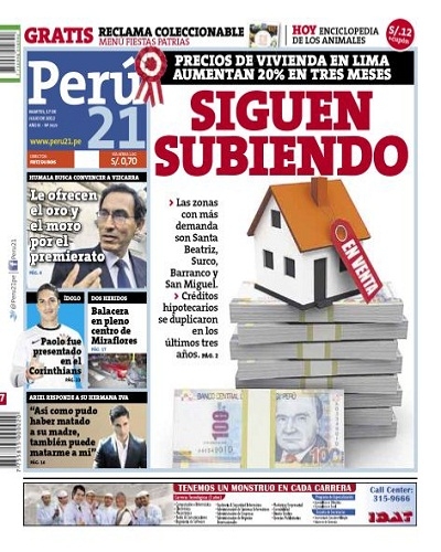 De otro lado, Perú 21 coloca en su primera hoja el panorama inmobiliario de Lima. El gerente general de la consultora Plusvalía, Ricardo Arbulú, en la capital existen 500 mil familias con posibilidades de acceder a un crédito hipotecario, e incluso tendrían la cantidad requerida para la cuota inicial. Sin embargo, al año se edifican 40 mil inmuebles, situación que debería cambiar para brindar mayores facilidades al consumidor, en palabras del especialista. Precisó, no obstante, que en las zonas de Santa Beatriz y el Centro de Lima por ejemplo, el valor de los departamentos y casas han subido un 24% en el último año.