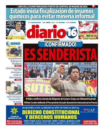 Finalizamos este repaso de los periódicos más importantes con Diario 16. Un video confirmaría la presunta adhesión del líder del Comité Nacional de Reorientación y Reconstitución Clasista del Sutep (Conare – Sutep), Efraín Condori Ramos, al grupo prosenderista “Movimiento por la Amnistía y Derechos Fundamentales” (Movadef), donde afirma que el Gobierno de Humala “ha dado un giro a la militarización y persecución principalmente a marxistas, leninistas, maoístas, ‘pensamiento Gonzalo’ y a los dirigentes de las luchas populares”.