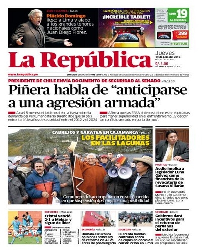 Entre los temas más destacados por la prensa escrita peruana para hoy jueves 19 de julio, se encuentra la presentación del programa “Estrategia Nacional de Seguridad y Defensa 2012-2014” (ENSYD), por parte del presidente chileno Sebastián Piñera al Senado de su país, con la finalidad de adelantarse a una supuesta “agresión armada de sus enemigos externos”.