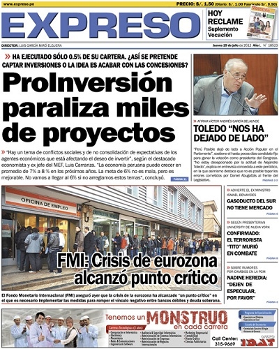 Por su parte, el vespertino Expreso cede su rostro a la Agencia de Promoción de la Inversión Privada (ProInversión. El director ejecutivo de esta institución, Milton von Hesse, precisó que hasta el momento se han pactado proyectos por un monto total de US$ 55 millones, lo que representa el 0.5% de la meta recordando que la cartera cuentan con US$ 10,000 millones para el etapa 2012-2013. Vale recordar que junto al Ministerio de Economía y Finanzas (MEF), ProInversión presentó 26 proyectos relacionados al sector transporte terrestre, ferroviario, hidrocarburos, telecomunicaciones, energía, agricultura, puertos, entre otros. “Nunca dijimos que al día siguiente de anunciar la cartera la estaríamos adjudicando”, argumentó von Hesse.