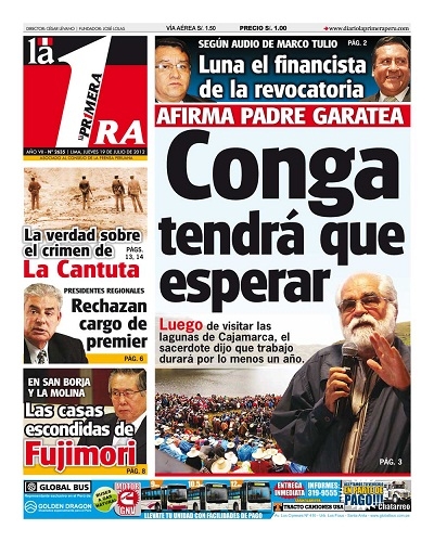 “Conga tendrá que esperar”, el titular va colocado en la portada de La Primera y se refiere a la frase que lanzó el padre Gastón Garatea. El eclesiástico, quien junto al arzobispo de Trujillo Miguel Cabrejos cumple el rol de facilitador de diálogo entre el Gobierno y las autoridades de Cajamarca sobre el polémico proyecto minero, advirtió que tomará por lo menos un año entablar un acuerdo con los renuentes a este último, razón por la que emitió la idea puesta líneas arriba. “En Cajamarca hubo mucha mentira en el pasado, por eso la gente no está dispuesta a soportar más mentiras”, sostuvo el religioso, señalando que la población local sigue temiendo por la contaminación del agua. Asimismo, ambos sostendrán hoy una reunión con los representantes de las 32 comunidades próximas a Conga, para tres horas después hacer lo mismo con algunos diversos movimientos religiosos.