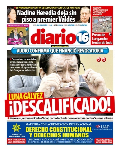 Ahora es el turno de Diario 16. Unos audios difundidos en un programa televisivo nocturno ponen contra la pared al congresista José Luna Gálvez (Solidaridad Nacional), quien al parecer se encargó de financiar parte de la campaña de revocatoria de la alcaldesa de Lima, Susana Villarán. “El asunto es que ese medio millón de soles nadie los quiere poner. Entonces, el único que pone plata es Luna. Luna tiene dinero. A toda esa gente le ha estado pagando. Nadie es gratis”, comenta en la grabación el abogado Marco Tulio Gutiérrez, uno de los principales impulsores de esta acción contra la burgomaestre de la capital. Asimismo, también son nombrados Walter Menchola, Fabiola Morales y un tal “Lucho”, cuya identidad se desconoce hasta el momento.