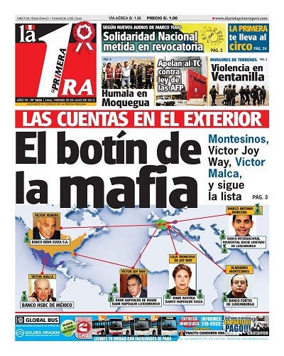“El botín de la mafia”, la línea presenta la información de La Primera y habla de los ex funcionarios que laboraron para el régimen del expresidente Alberto Fujimori. El medio afirma que las autoridades que investigación los supuestos actos de corrupción ocurridos en ese periodo tienen localizadas siete cuentas bancarias en el exterior pertenecientes a estas personas, que en total llegaría a los 20 millones de dólares. Entre estos están los nombres de Víctor Alberto Venero Nazar, Víctor Joy Way, Lilia Abdel Troncoso (esposa de Joy Way) y Marco Antonio Ibárcena Dworzak, por decir solo algunos.