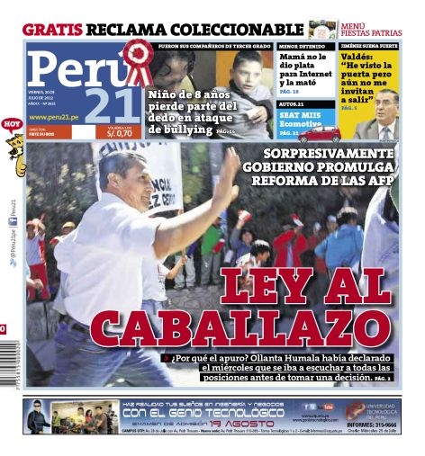 Culminamos este repaso de los vespertinos más importantes con Perú 21. El periódico también hace hincapié en la aprobación de la promulgación de la Ley de Reforma de las AFP, recordando la frase del jefe de Estado Ollanta Humala respecto a conocer los puntos de vista relativos que permitan la construcción de una decisión, pese a que la medida fue divulgada de manera oficial al día siguiente de sus declaraciones.