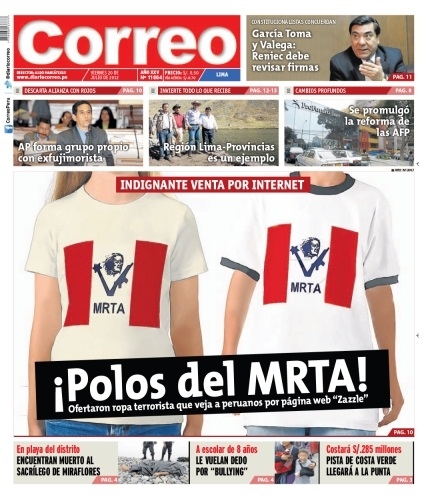Ahora estamos con Correo. El portal estadounidense Zazzle.com ofrece en su espacio digital polos, gorras, corbatas, mandiles, tazas, posters, stickers e incluso ropa para mascotas con la bandera del grupo terrorista Movimiento Revolucionario Túpac Amaru (MRTA). Asimismo, estos productos se venden entre 22.40 a 26.90 dólares, aunque se desconoce el proveedor de los mismos, causando sin embargo ácidas críticas por parte de la población peruana en las redes sociales.