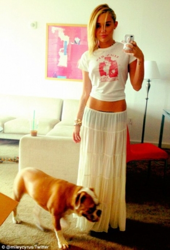 Miley twitteó la foto con la leyenda: "El uso de mi camiseta de la suerte :) fuera a hacer dopest s ** t everrrr".