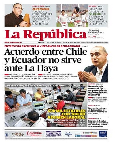 Por su parte, el diario La República se ocupa del diferendo marítimo que sostienen Perú y Chile. El viceministro ecuatoriano de Relaciones Exteriores, Marco Albuja, aclaró que la declaración firmada entre su país con el gobierno chileno para respetar los límites marítimos el último 26 de julio, no significa que la gestión del mandatario Rafael Correa será parcial respecto al fallo que emita la Corte Internacional de La Haya (Holanda). “Aquí quisiera ser muy claro. Existen intereses, lastimosamente, tanto en Chile como en Perú de que Ecuador tenga un pronunciamiento a favor o en contra de sus tesis para ser esgrimida en La Haya. Ecuador siente que hay una intención de ciertos sectores para que las relaciones entre Ecuador y Perú se enfríen”, sostuvo el funcionario ecuatoriano.