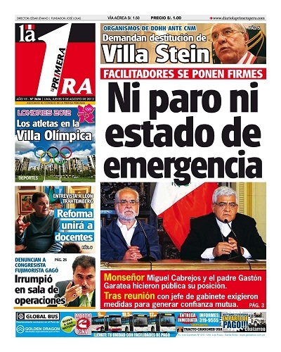 De otro lado, La Primera pone en su entrada el proyecto Conga. Tras reunirse con el Gabinete ministerial, los facilitadores del diálogo en Cajamarca Miguel Cabrejos y Gastón Garatea plantearon el levantamiento del estado de emergencia en la región, al igual que las manifestaciones antimineras por el citado programa de parte de sus promotores. Asimismo, consideran necesario la conformación de comisiones del gobierno central, regional y de la propia firma Yanacocha, con la finalidad de agilizar las negociaciones para hallar una solución pacífica al conflicto social imperante.