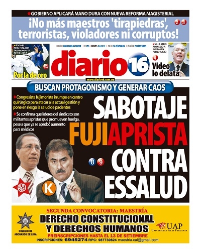 “Sabotaje Fujiaprista contra EsSalud”. El titular pertenece a Diario 16 y hace referencia al parlamentario fujimorista Julio Gagó (Fuerza 2011). De forma inesperada, el legislador irrumpió en el centro quirúrgico del Hospital Almenara para celebrar una conferencia de prensa, donde cuestionó a la actual administracion de EsSalud presidida por Álvaro Vidal, lo que “puso en peligro la salud y la vida de los pacientes”, según el gerente de la red asistencial del nosocomio Melchor Gutarra Álvarez.
