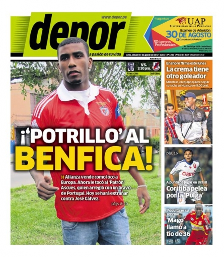 Por su parte, el diario Depor también resalta en su portada al joven zaguero íntimo que pasa al cuadro luso y titula: '¡Potrillo al Benfica!'.