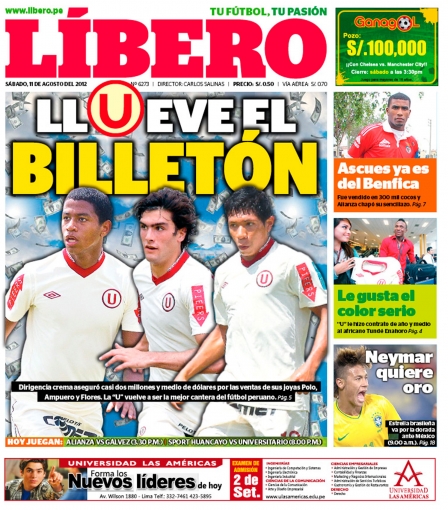 Los principales diarios deportivos del país informan en sus portadas de hoy sábado 11 de agosto sobre la suma de dos millones y medio de dólares que ganará el club Universitario de Deportes por la venta de sus juveniles Andy Polo, Álvaro Ampuero y Edison Flores a Europa.