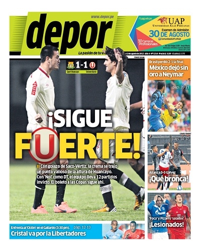 De otro lado, Depor coloca en su portada la medalla de oro que logró México contra Brasil en las Olimpiadas de Londres 2012. El sorpresivo primer gol del partido llegó por obra de Oribe Peralta apenas a los pocos segundos de iniciado el juego y luego de un error defensivo carioca. Ya en el segundo tiempo y tras varias llegadas por ambos lados vendría el segundo gol mexicano también por obra de Peralta a los 71 minutos.