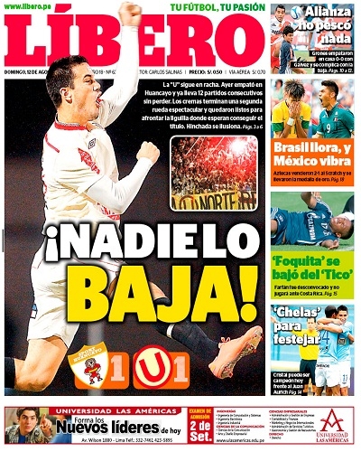 Los principales diarios deportivos del país informan en sus portadas de hoy domingo 12 de agosto, del empate a un gol que consiguió Universitario de Deportes en su visita a la altura de Huancayo con precisamente Sport Huancayo.