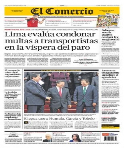 La noticia ganó la portada del decano de los medios locales, El Comercio. El asesor en temas viales de la comuna capitalina, Gustavo Guerra García, reveló que la gestión de la burgomaestre Susana Villarán se inclinaría por esta opción y la haría pública en las próximas dos semanas.