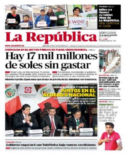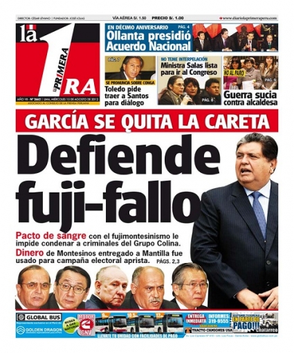 Por su parte, el periódico La Primera cene importancia al expresidente Alan García. El líder del Partido Aprista Peruanopidió respetar el fallo en favor de los integrantes del Grupo Colina emitido por la Sala Penal del Poder Judicial presidida por Javier Villa Stein, que les reduce los años en cárcel y deja de lado el concepto de lesa humanidad en los casos, afirmando que esta instancia es independiente y que si no se acata esta conclusión “la democracia no se diferenciaría de una dictadura”. Al respecto, el abogado Carlos Rivera del Instituto de Defensa Legal dijo que no le parecía extraño este tipo de comentarios del exmandatario.