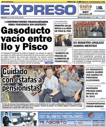 Ahora estamos con el vespertino Expreso. El Gobierno ha solicitado al Congreso de la República declarar de interés nacional la construcción del ducto de etano entre las localidades de Pisco e Ilo, con el objetivo de desarrollar la industria petroquímica en el sur del país. Sn embargo, el medio afirma que las reservas de gas no están comprobadas, desconociéndose además los mercados a los que iría el producto aunque sí el supuesto desinterés de las empresas privadas a participar en el proyecto.