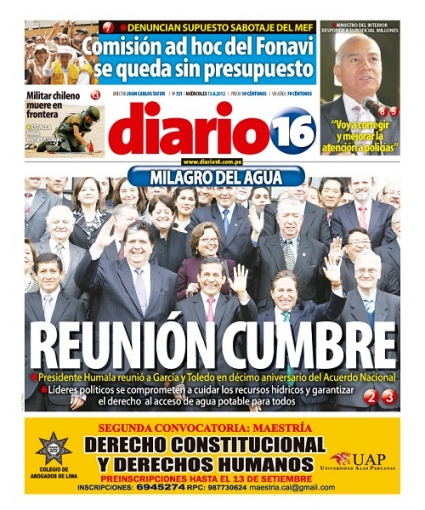 “Reunión cumbre”. El titular pertenece a Diario 16 y se refiere al encuentro que sostuvo el presidente Ollanta Humala con los exmandatarios Alejandro Toledo y Alan García en Palacio de Gobierno. El encuentro correspondió a la centésima primera sesión del Acuerdo Nacional que presenta la política de Estado sobre Recursos Hídricos que conmemoró el décimo aniversario de su creación.