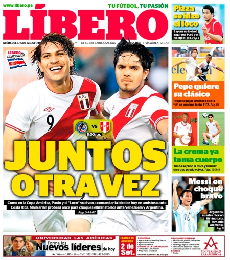 De esta manera, el diario Líbero tituló: 'Juntos otra vez', en referencia a la presencia en el equipo titular de Juan Vargas y Paolo Guerrero, tal cual como sucedió hace un año en la Copa América de Argentina donde el cuadro dirigido por Sergio Markarián logró el tercer puesto.