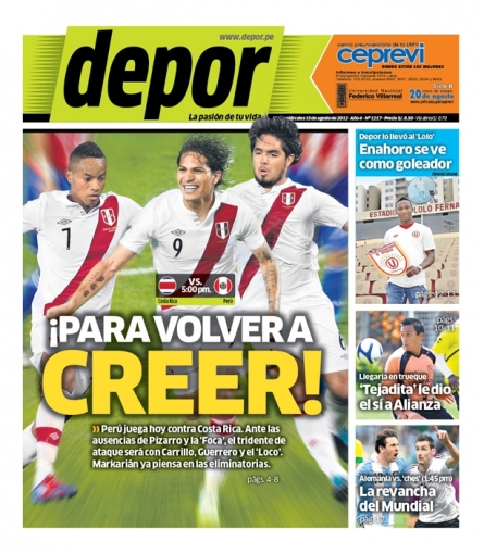 Por su parte, el diario Depor también resalta el encuentro amistoso de la 'blanquirroja' y titula: '¡Para volver a creer!' con el tridente ofensivo que será conformado por André Carrillo, Juan Vargas y Paolo Guerrero.