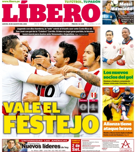 De esta manera, el diario Líbero tituló: 'Vale el festejo', en referencia al triunfo peruano que le permite agarrar moral para los decisivos duelos de Eliminatorias en Lima ante Argentina y Venezuela el 7 y 11 de setiembre, respectivamente.