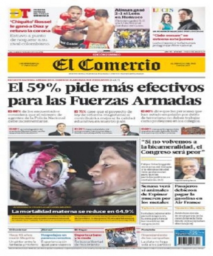 Cerramos este recorrido con el decano de la prensa local, El Comercio, que acaba de publicar un estudio relativo a la seguridad en el interior de Perú, donde el 59% de peruanos pide más efectivos para las Fuerzas Armadas, por ejemplo.