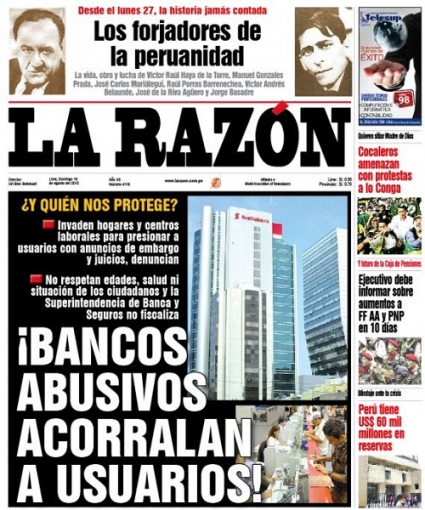 Ahora es el turno del vespertino La Razón. El congresista Yohny Lescano aseguró que algunas entidades financieras amenazan a las personas, a cualquier hora del día, con apartarlos del sistema financiero o embargarles sus sueldos y viviendas por una deuda que mantienen, a pesar que esta actitud está penada de acuerdo al Código de Defensa del Consumidor.