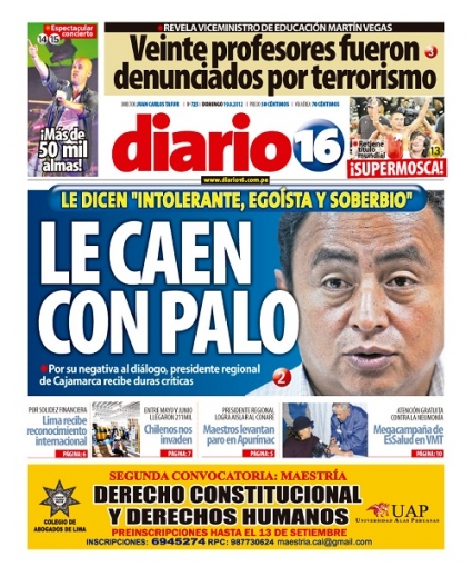 El conflicto social en Conga, por otro lado, ganó la primera hoja de Diario 16. El ex titular de la Conferencia Episcopal, Luis Bambarén, se pronunció respecto a la inasistencia del presidente regional de Cajamarca Gregorio Santos a la primera reunión que convocaron los facilitadores de diálogo Gastón Garatea y Miguel Cabrejos, para negociar una solución pacífica a la situación que atraviesa el departamento por la renuencia a la ejecución del proyecto minero Conga, calificando al segundo como una persona “intolerante, egoísta y soberbia”.