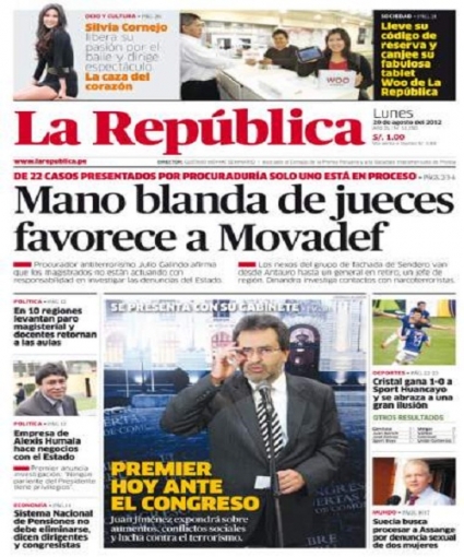 De otro lado, el periódico La República pone en su primera hoja la situación actual del Movimiento por Amnistía y Derechos Fundamentales (MOVADEF). El procurador antiterrorista Julio Galindo señaló que algunos jueces no muestran firmeza en sus investigaciones sobre terrorismo, revelando que de 22 casos presentados en el año 2009, por ejemplo, solo una ha sido procesado, y corresponde al de 7 detenidos por hacer pintas en una de las calles de Villa María del Triunfo.