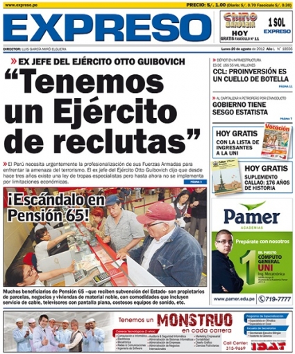 “En el Perú tenemos un Ejército de reclutas”, la fresa proviene del vespertino Expreso y fue emitida por el ex jefe del Ejército Otto Guibovich. El especialista se pronunció respecto a los 5 soldados caídos en la base de Mazángaro en la provincia de Satipo, producto de un atentado narcoterrorista, indicando que el Perú “no puede seguir enfrentando al terrorismo con personal no profesional”.